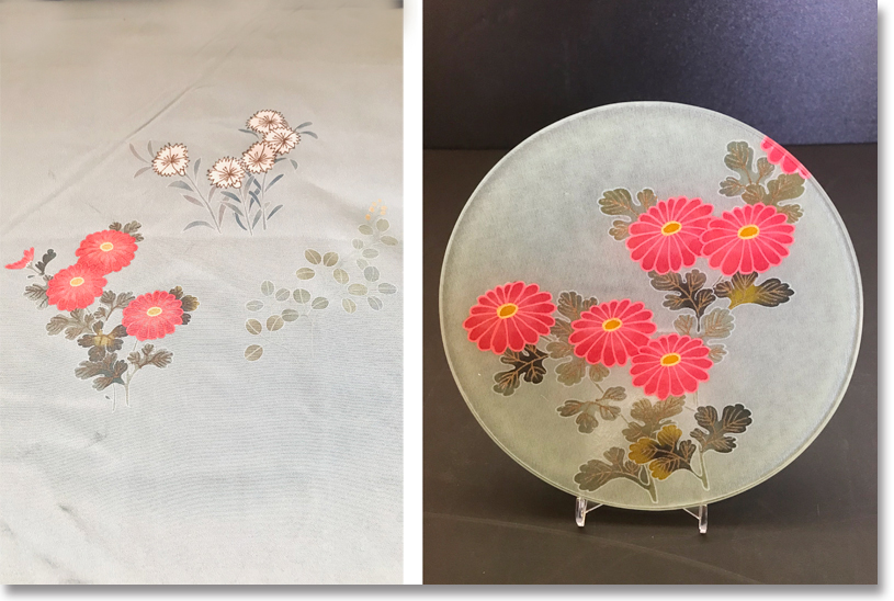 稲手 「友禅ガラス」という名称で、着物地や帯地、帯揚げなどを活用し、伝統的な図柄をそのままお皿などに加工する技術なんですよ。簡単に説明すると、まずガラスの板に着物などの素材をUV粘着シートで接着し、裏から樹脂素材の保護フィルムで挟み込みます。そして、時間をかけてゆっくりと高温高圧加工していくんです。ぜひ、実物をお手に取ってみてください。