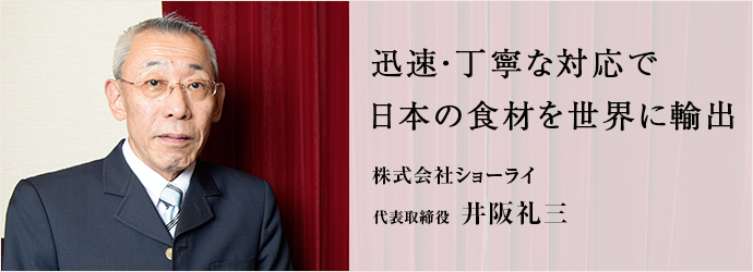 プロフィール 和歌山県出身。大学を卒業後、食品の大手卸会社に就職する。13年間勤めた後、貿易会社に転職。タイやスリランカ、スコットランドなど多くの国の輸出入に関わる。2000年4月、(株)ショーライへ入社と同時に香港の日本食品の輸入・販売会社に出向し、2014年5月に帰国。その後、創業者の後を継ぎ代表取締役に就任。少数精鋭のスタッフと共に食材の輸出を手がけている。