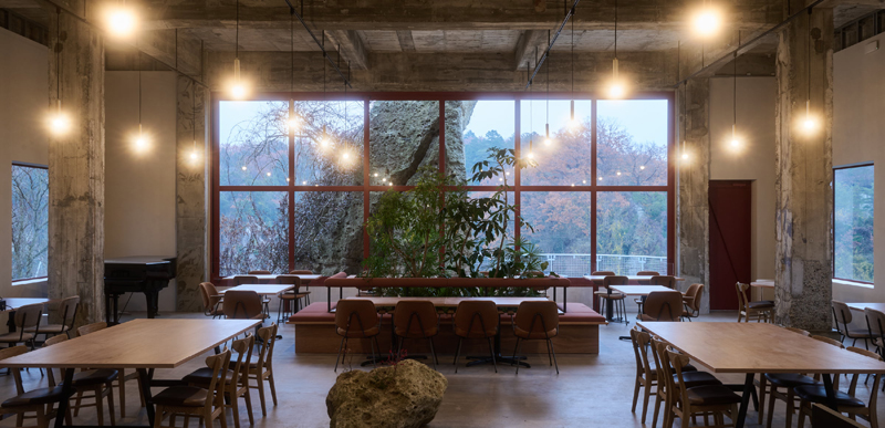 目指したのは、建物を新しくすることではなく、土地が持つ記憶や景観を尊重し、現代の価値観で再編成すること。もともとさまざまな形で館内に点在していた大谷石を極力活かし、解体せざるを得なかった大谷石は、テラスでベンチやテーブルとして利用できるよう整備されました。間近に感じる岩肌や自然光、通り抜ける風――唯一無二の条件を制約ではなく強みに変え、施設全体が“体験の場”として構想されています。